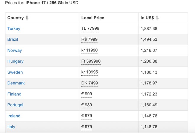 Conforme dados disponibilizados por uma plataforma especializada em reunir os preços dos smartphones da Apple, o iPhone 17 brasileiro só perde para o turco no ranking global.